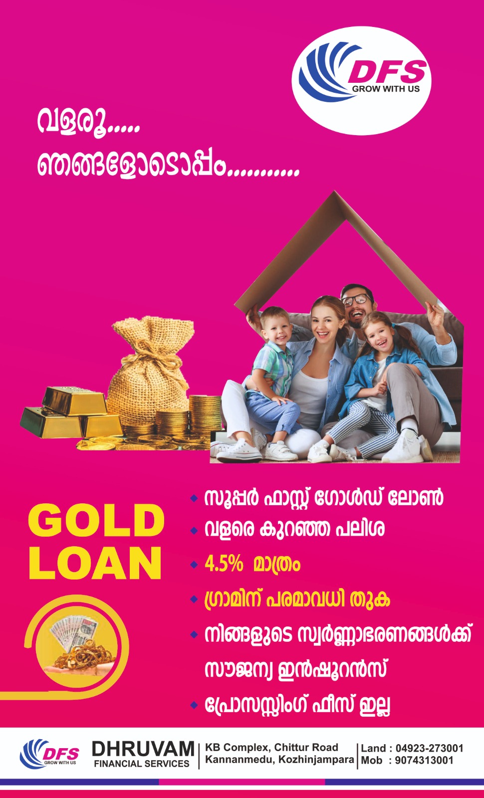 Dhruvam Financial Services AKA DFS is a Non Banking Financial service provider and money lenders approved by the Govt of Kerala. We offer all essential financial services like Gold Loan, Motor insurance, health Insurance , Flight tickets wealth management etc. Our conditions are open, for we do what we declare. We have no hidden agenda and keep 100 % transparency in all our dealings. Our interest rates are low compared to the present industry standard. We are ready to extend maximum help on liberal conditions to meet all your needs . We can be your friend and guide whenever you are in financial troubles .Please step in to our office to get more details and ring in our office number. We will be more happier in meeting you personally . Please do come.